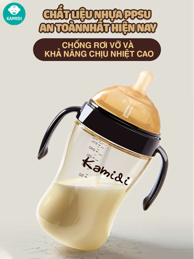 - Bình sữa Kamidi nhựa PPSU với thân bình bằng nhựa PPSU cao cấp, cứng cáp, độ bền cao, thân bình trong suốt.