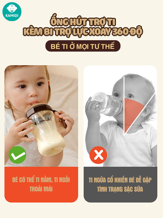 Ống hút silicone gắn bi trọng lực xoay 360 độ giúp bé bú được trong mọi tư thế, chống tràn sữa cực tốt. Với các loại bình trên thị trường thường mẹ sẽ phải dốc bình lên cho bé bú điều này làm con khó chịu và khi bé lớn hơn một chút sẽ không chịu hợp tác. Do đó dùng bình Kamidi bé sẽ có thể tự cầm bình uống ngon lành, tu ti đủ các tư thế nằm, ngồi, đứng.