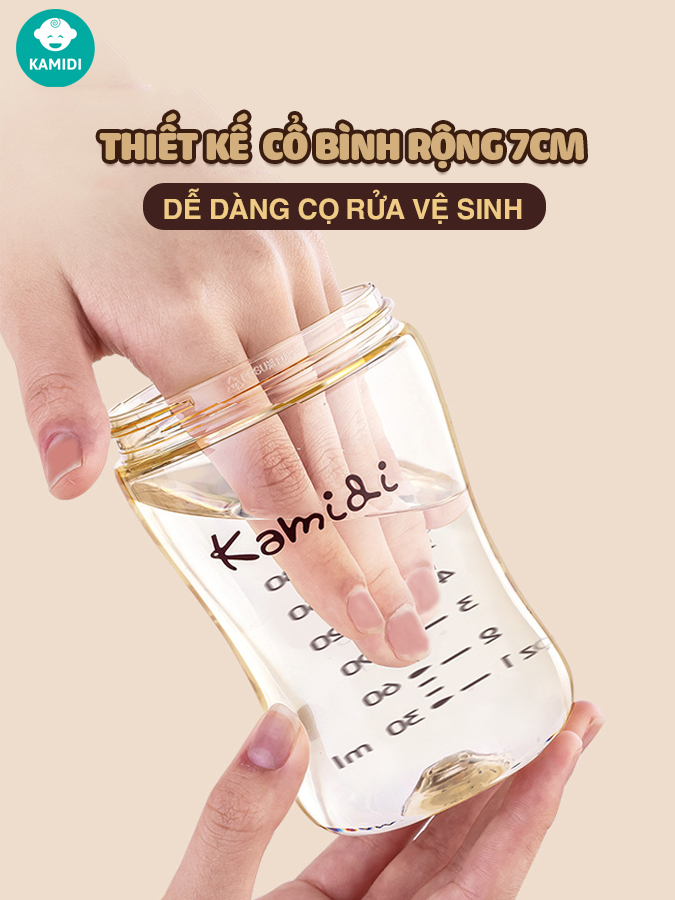Bình sữa Kamidi nhựa PPSU với thân bình bằng nhựa PPSU cao cấp, cứng cáp, độ bền cao, thân bình trong suốt.