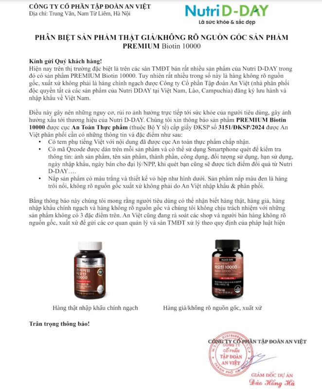 Chúng tôi xin thông báo sản phẩm PREMIUM Biotin 10000 được cục An Toàn Thực phẩm (thuộc Bộ Y tế) cấp giấy ĐKSP số 3151/ĐKSP/2024 được An Việt phân phối cần có những thông tin và đặc điểm như sau: