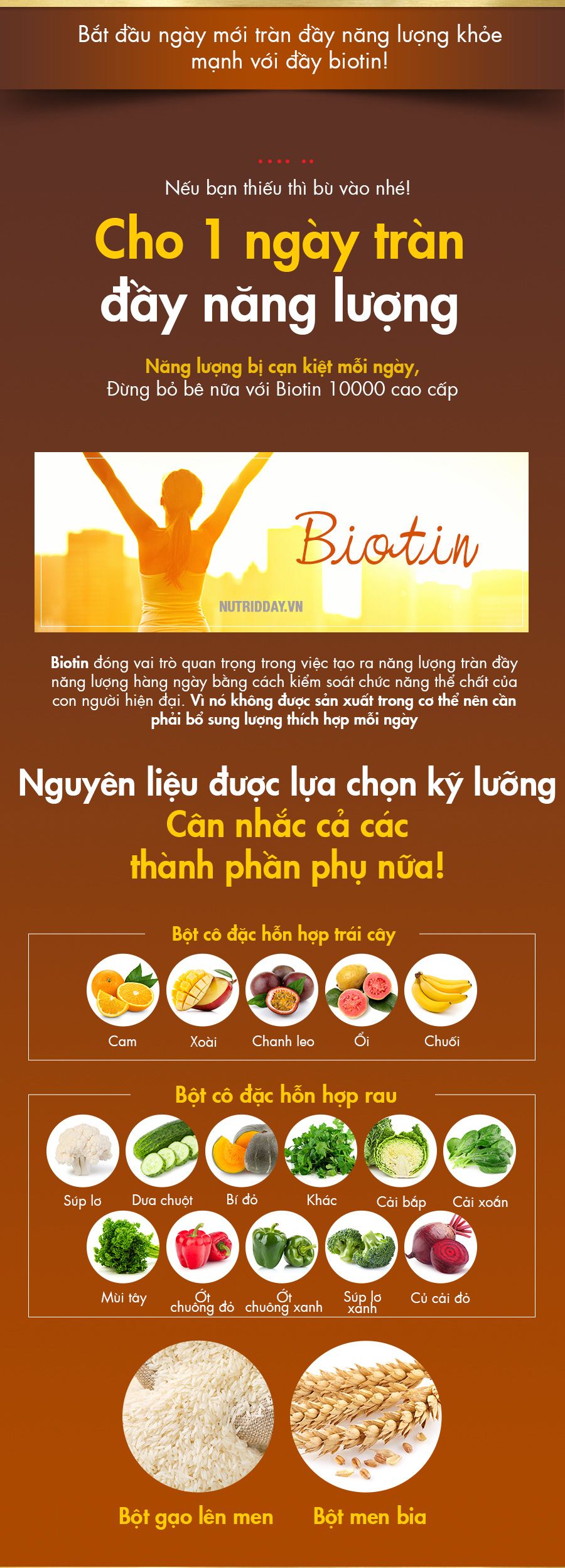 Bổ sung Biotin cho cơ thể. Hỗ trợ quá trình chuyển hoá chất béo, carbohydrate, protein và sản xuất năng lượng cho cơ thể.